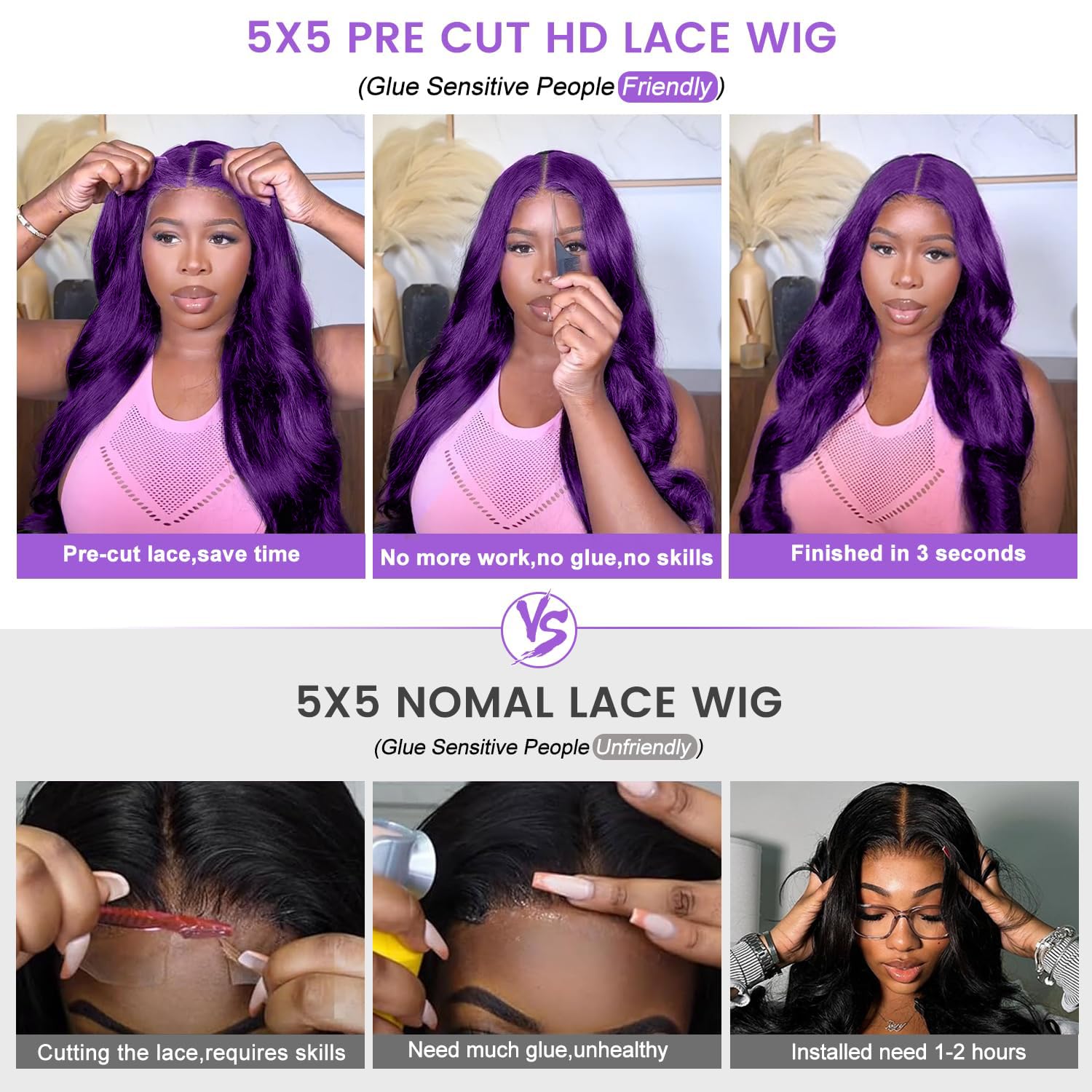 - 【5x5 Body Wave Closure Wig】200% Density Purple Lace Front Wigs Human Hair, Suitable For Anyone. Purple Lace Front Wigs Human Hair Can Be Parted In The Middle, Side Parted And Free Parted. 100% Human Hair Colored Body Wave Wig Can Be Restyled, Can be Straightened, Curled, Bleached, Dyed, Permed, Durable, Reusable. 5x5 Wig Can Make High Ponytail, Bun, Half Up Half Down Style, Styling As You Like.