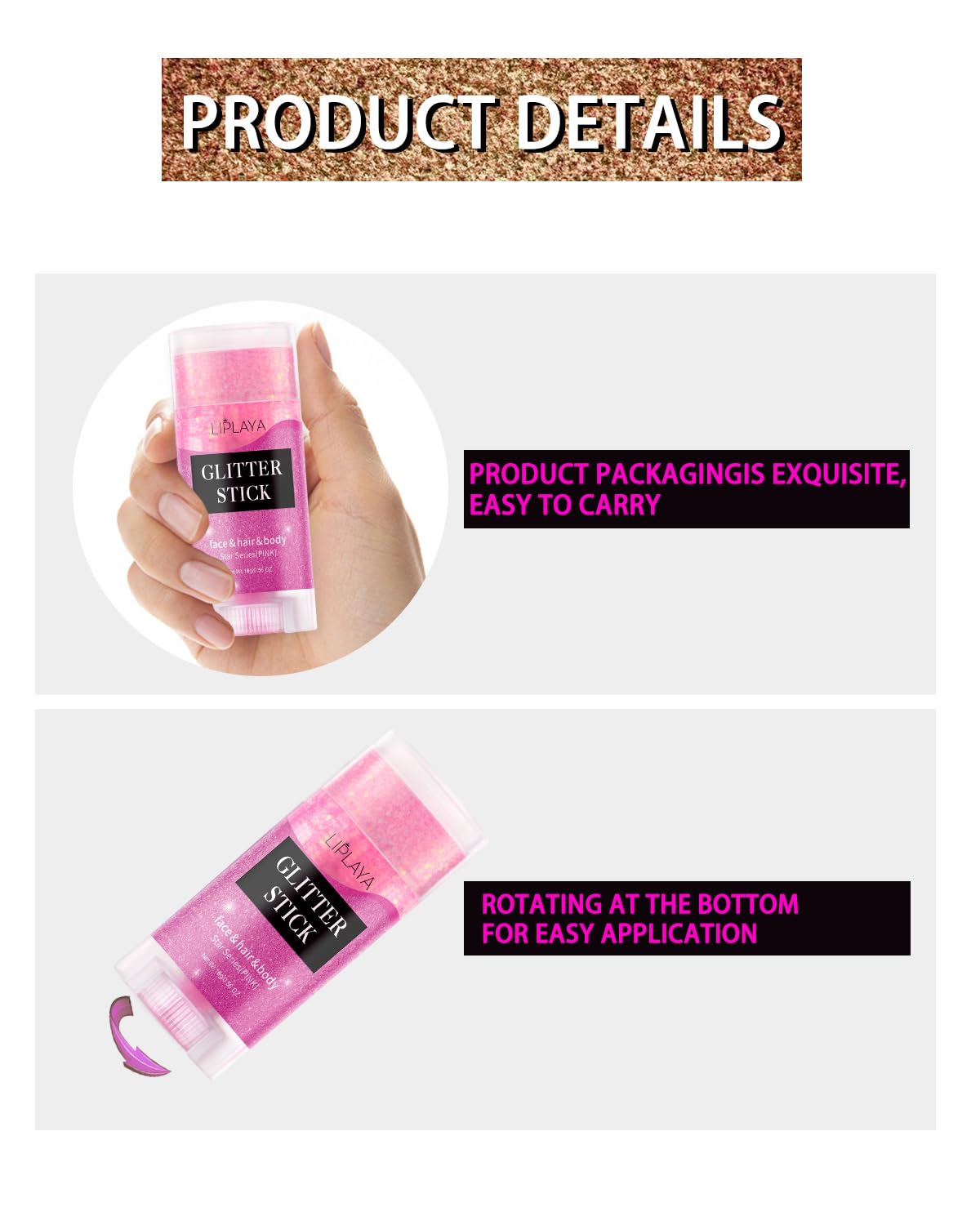 - Body glitter stick adopt rotating packaging, paste design, it can be applied directly without makeup brush or sponge.