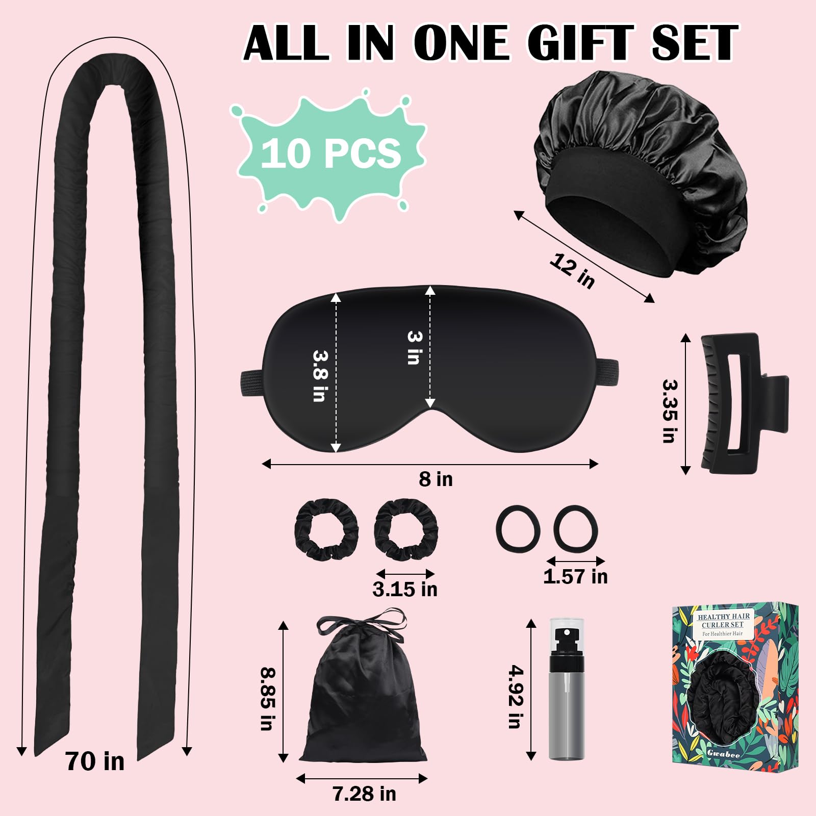 - Thoughtful Set for Women: Our heatless curling set includes 10 items: 1 x 70-inch long satin curling rod headband, 1 x satin hair bonnet for sleep, 1 x silk satin sleep eye mask, 1 x hair clip, 2 x satin hair ties, 2 x elastic hair ties, 1 x satin storage bag, and 1 x spray bottle. This all-in-one curling rods set is packaged in an exquisite box, making it the perfect present for your wife, mother, daughter, friends, or colleagues
