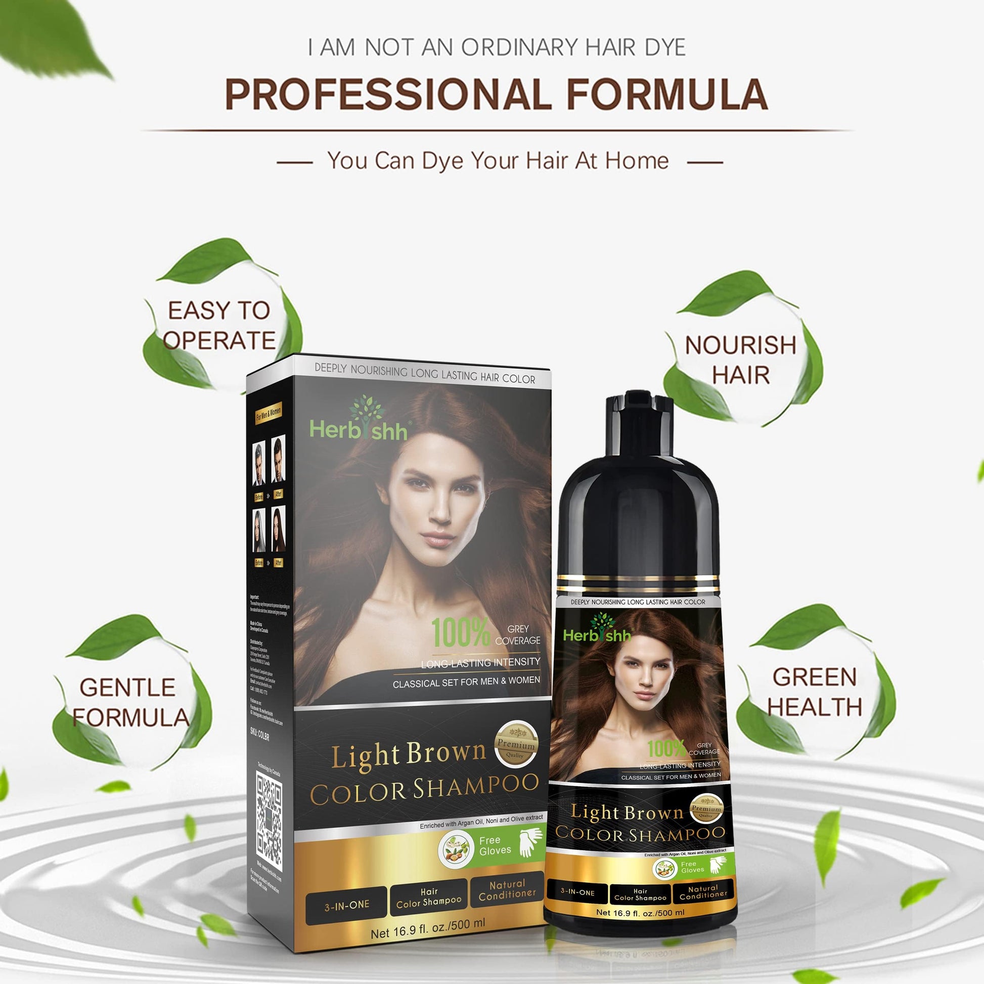 Herbishh 3-In-1 Magic Hair Dye Shampoo for Gray Hair - Light Brown, 500 Ml, Ammonia-Free, Long Lasting, Colors Hair in Minutes,Unisex