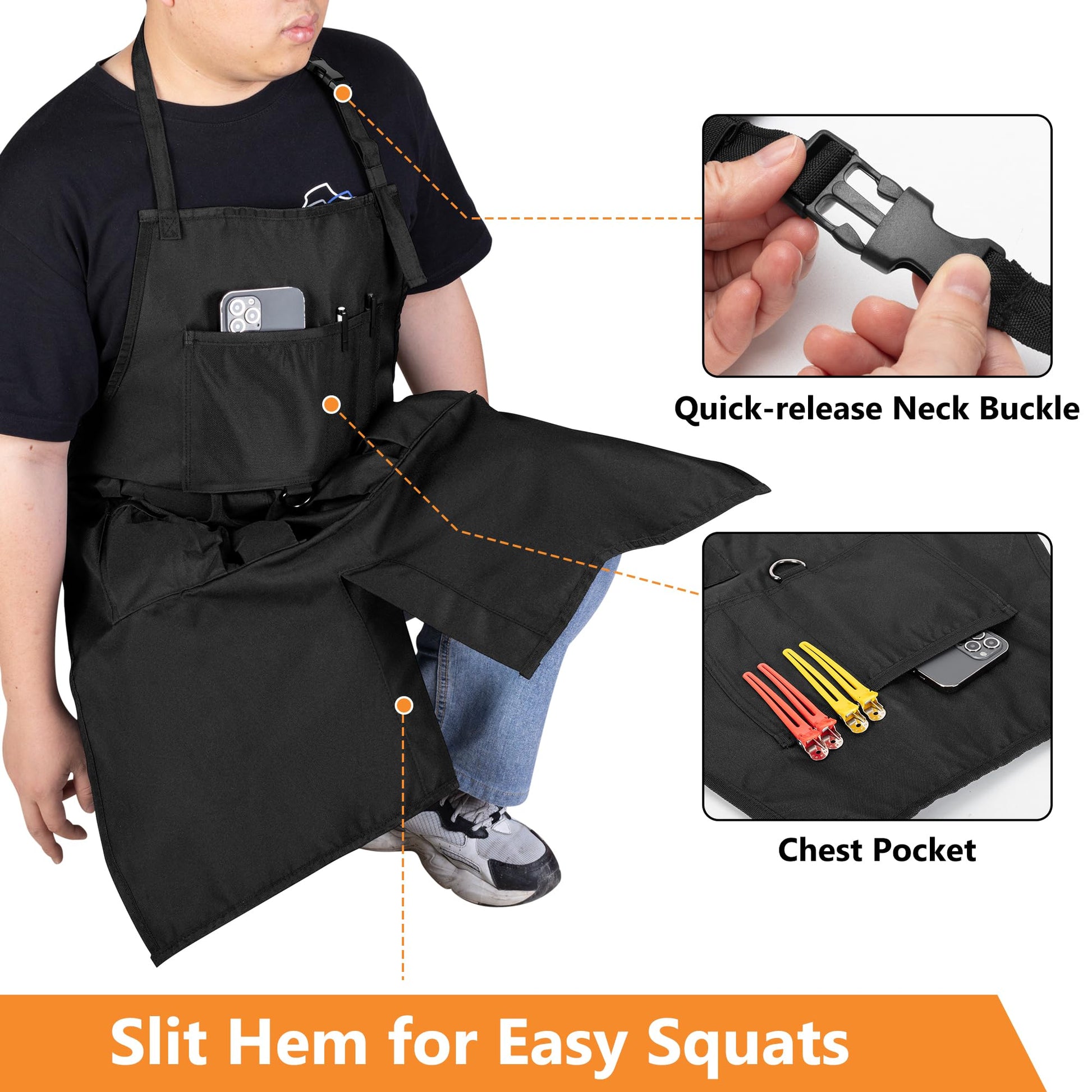 - Multifunctional Pockets: 5 deep pockets for easy access to various barber tools; a chest pocket to hold your cell phone as well as hair clips; lower elastic-top pockets for cutting scissors, hair clippers, hair comb as well as other supplies
