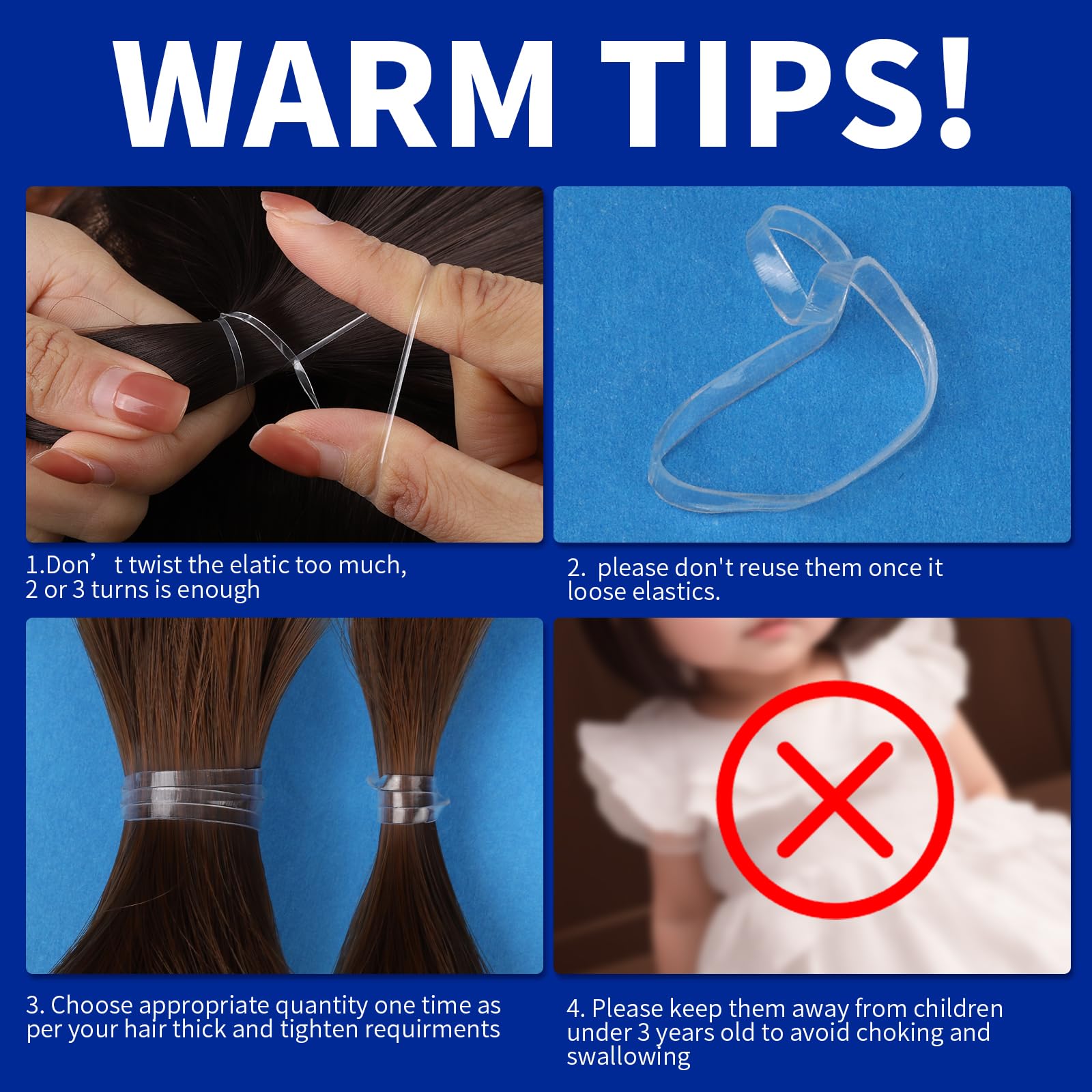 - Warm Tip: You can choose the right amount at a time according to your hair's thickness and tightness requirements. The clear rubber bands are disposable, if you reuse them, they will get bigger each time, please don't reuse them